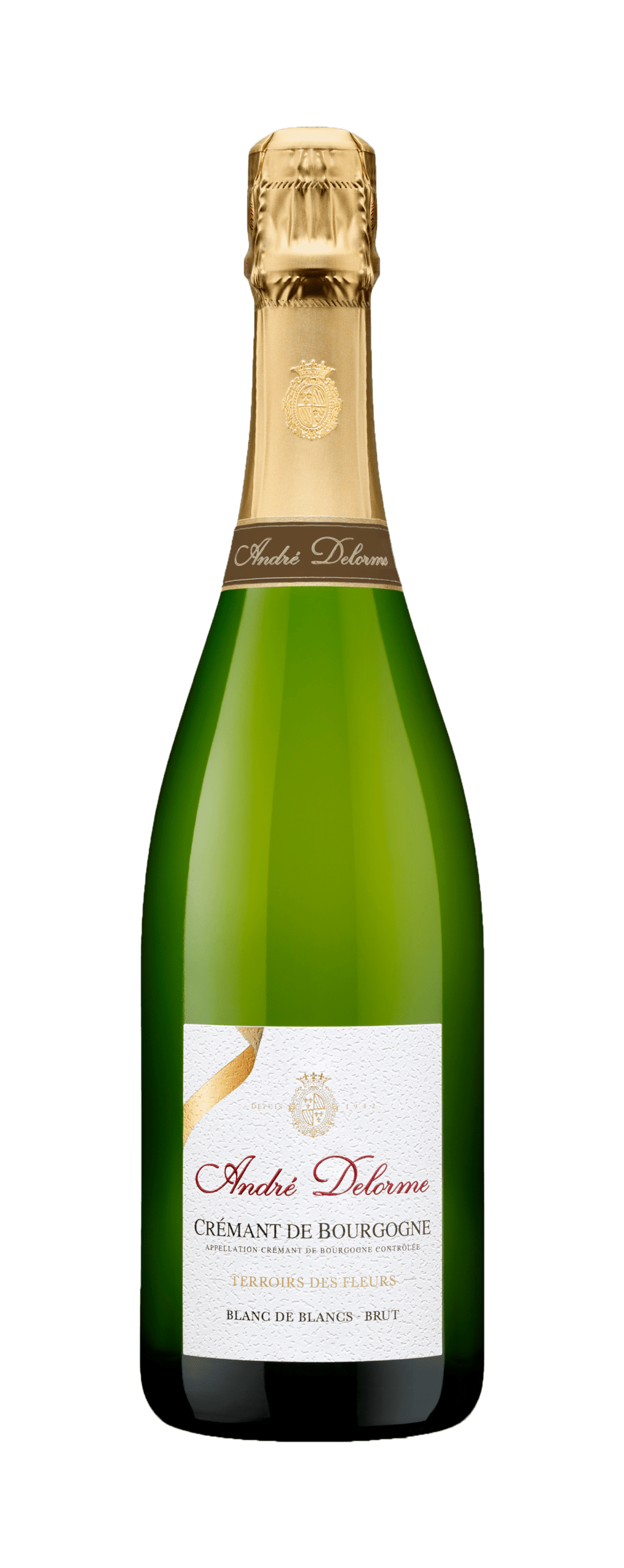 Our Terroirs des Fleurs cuvée refers to white flowers: hawthorn, acacia and honeysuckle. This is a Blanc de Blancs made from grapes grown on parcels producing wines with predominantly floral aromas (characteristic of Mâconnais wines). Made exclusively from Chardonay and Aligoté grapes, its fine, elegant aroma is characteristic of the Delorme style. The colourful bands on its pearly label reflect its luminous personality.