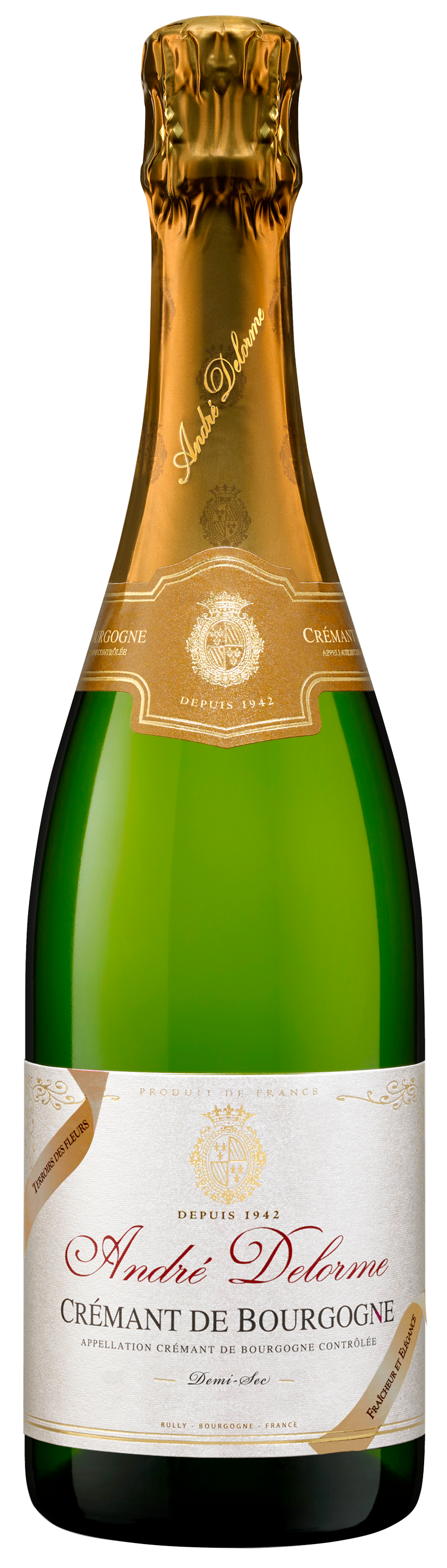 Notre cuvée Terroirs des Fleurs fait référence aux fleurs blanches : aubépine, acacia et chèvrefeuille. C’est un Blanc de Blancs c’est à dire un assemblage de cépage produisant des raisins à peau blanche avec un dosage Demi-Sec offrant donc plus de richesse et de douceur. Les raisins proviennent de parcelles produisant des vins à prédominance aromatique de fleurs (caractéristique que l’on retrouve habituellement dans les vins du mâconnais). C’est ce qui apportent cette belle gourmandise mais aussi de la finesse et de l’élégance aromatique, caractéristiques du style Delorme. Cette cuvée est élaborée exclusivement à partir de cépages Chardonay et Aligoté. Les bandeaux colorés de son étiquette nacrée le distingue et reflète sa personnalité lumineuse ainsi que l’excellence des vignerons de la Maison au travers du temps.